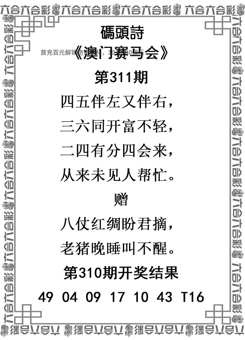 311期解析:四五伴左又伴右,三六同开富不轻,二四有分四会来,从来未见人帮忙。 综合生肖:猪龙羊牛鼠蛇 |