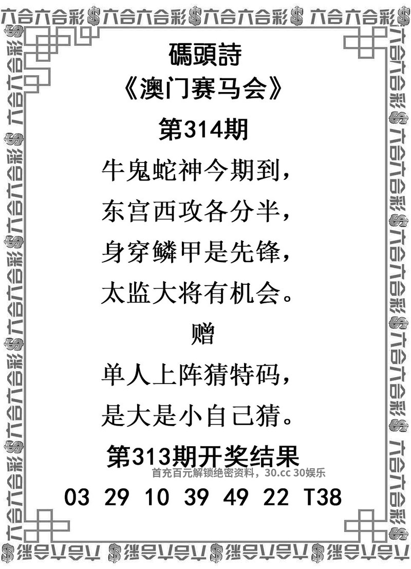 314期解析:牛鬼蛇神今期到,东宫西攻各分半,身穿鳞甲是先锋,太监大将有机会。 综合生肖:牛蛇鼠狗马羊 |